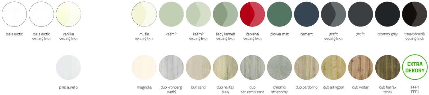 Elegantní a trendová kuchyně. Přední plochy v moderních jednobarevných provedeních lze kombinovat s příjemnými dřevodekory.